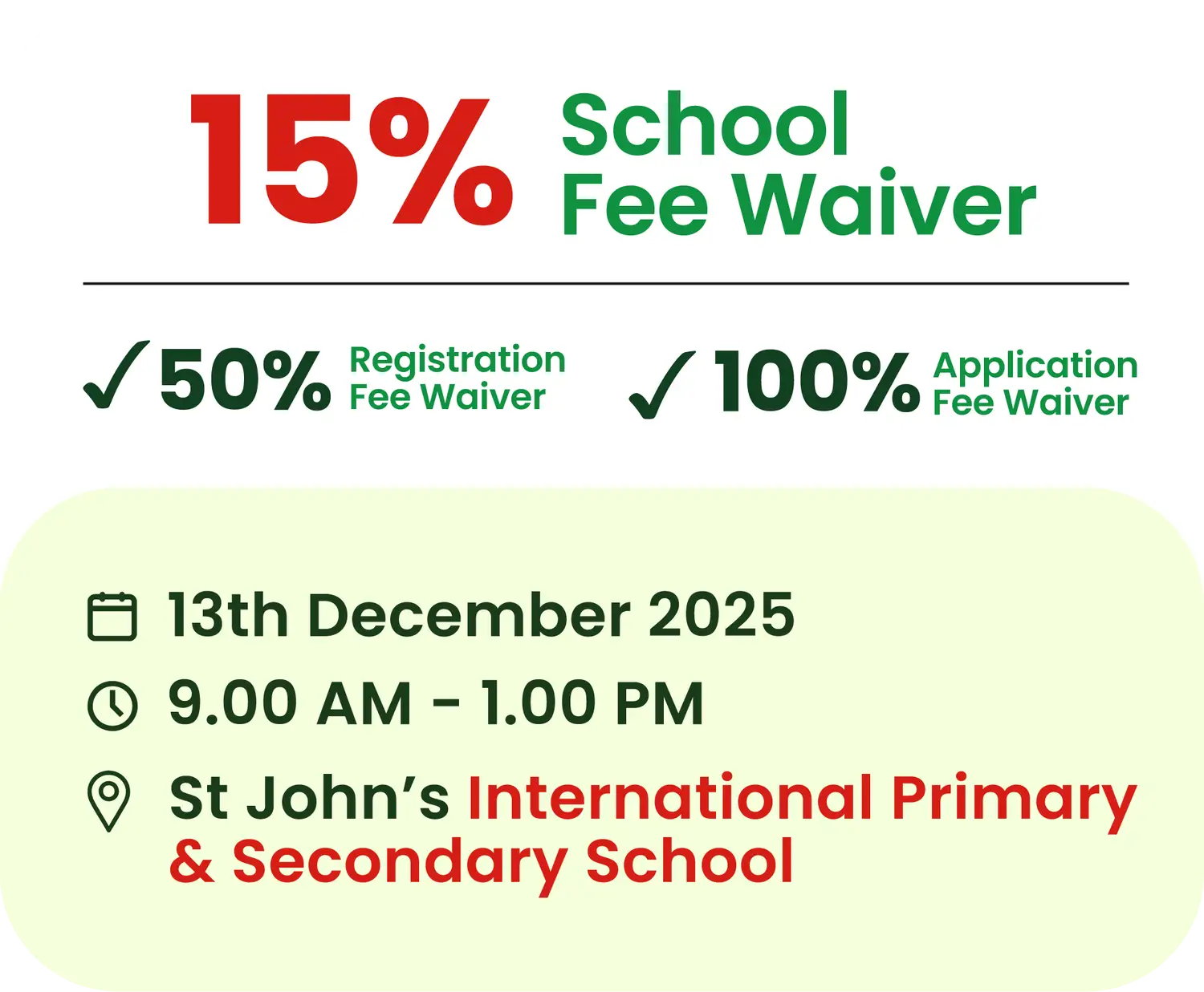 St. John's International Primary & Secondary School offers a seamless Cambridge educational journey from Preschool (K1) to Secondary (Year 11). Our mission is to develop confident, compassionate learners through quality teaching, holistic development, and values-based education inspired by Lasallian principles.